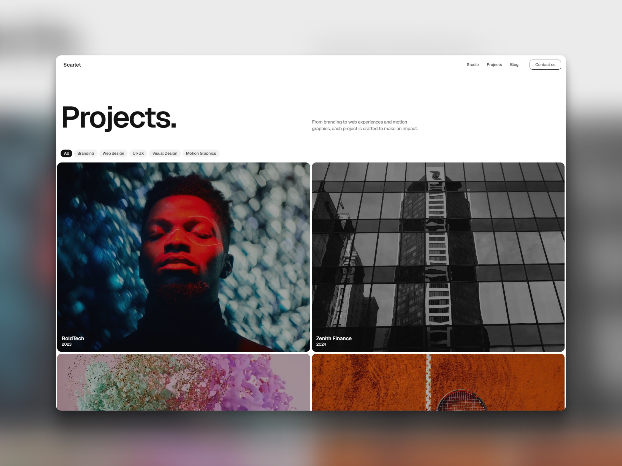 Scarlet is a modern template for design agencies, creative studios, and personal portfolios. It offers a seamless user experience with bold typography, smooth animations, and a clean layout.